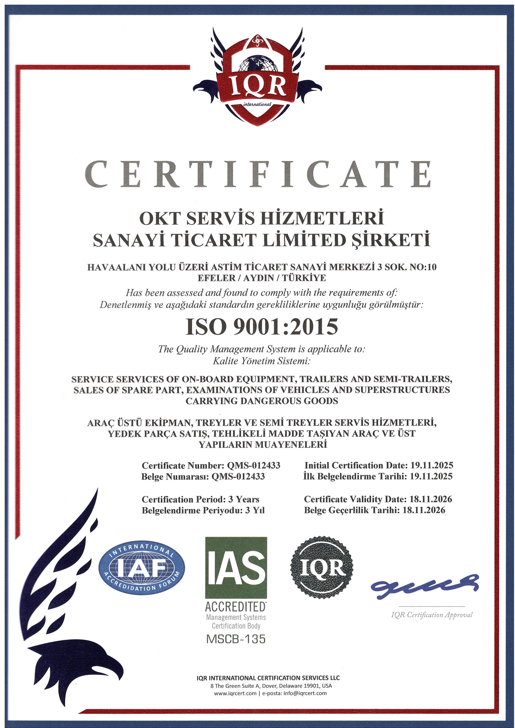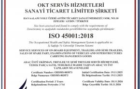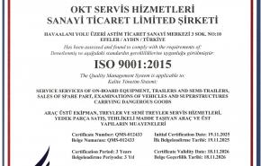 OKT Servis ADR Muayene Merkezi; Aydın ASTİM Organize Sanayi Bölgesi' ndeki tesislerinde, TSE Uzmanı kontrolünde gerçekleştirilmekte ve kontrol edilen araçlara ADR Uygunluk (T9) muayene sertifikaları verilmektedir.