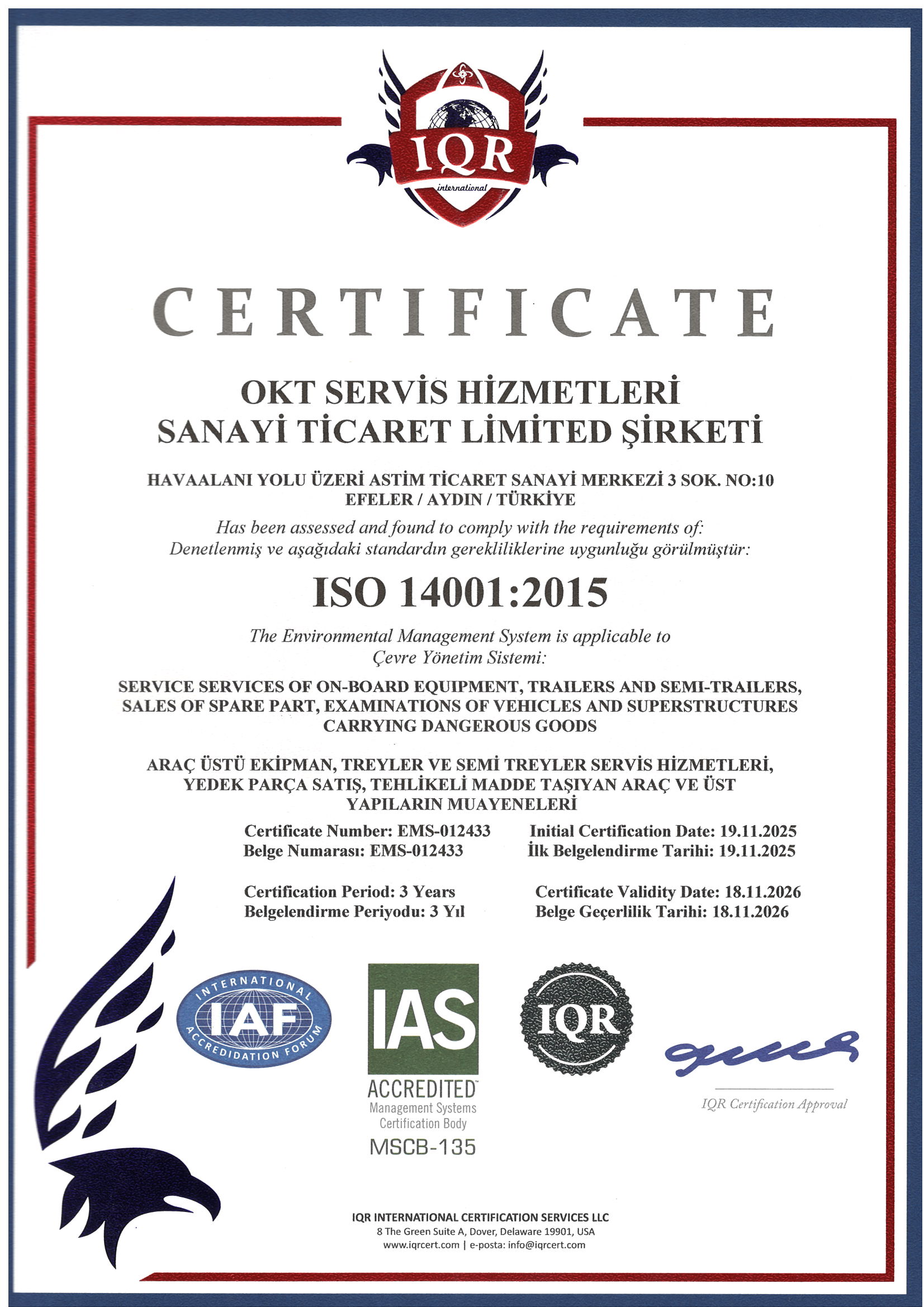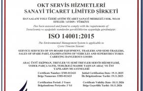 OKT Trailer’ ın tehlikeli madde taşımacılığı konusundaki sorumluluğu sadece üretim ile sınırlı değil. OKT Servis Hizmetleri ile tehlikeli yüklerin karayoluyla taşınmasında can, mal ve çevre açısından güvenliği temin etmek için, tehlikeli yük taşıyan ADR’li araçların ve üst yapılarının teknik muayenelerinin de etkin ve sağlıklı bir şekilde yapılmasını sağlamak üzere Ulaştırma ve Altyapı Bakanlığı tarafından yetkilendirilen, Ege bölgesindeki ilk ADR Muayene Merkezi.