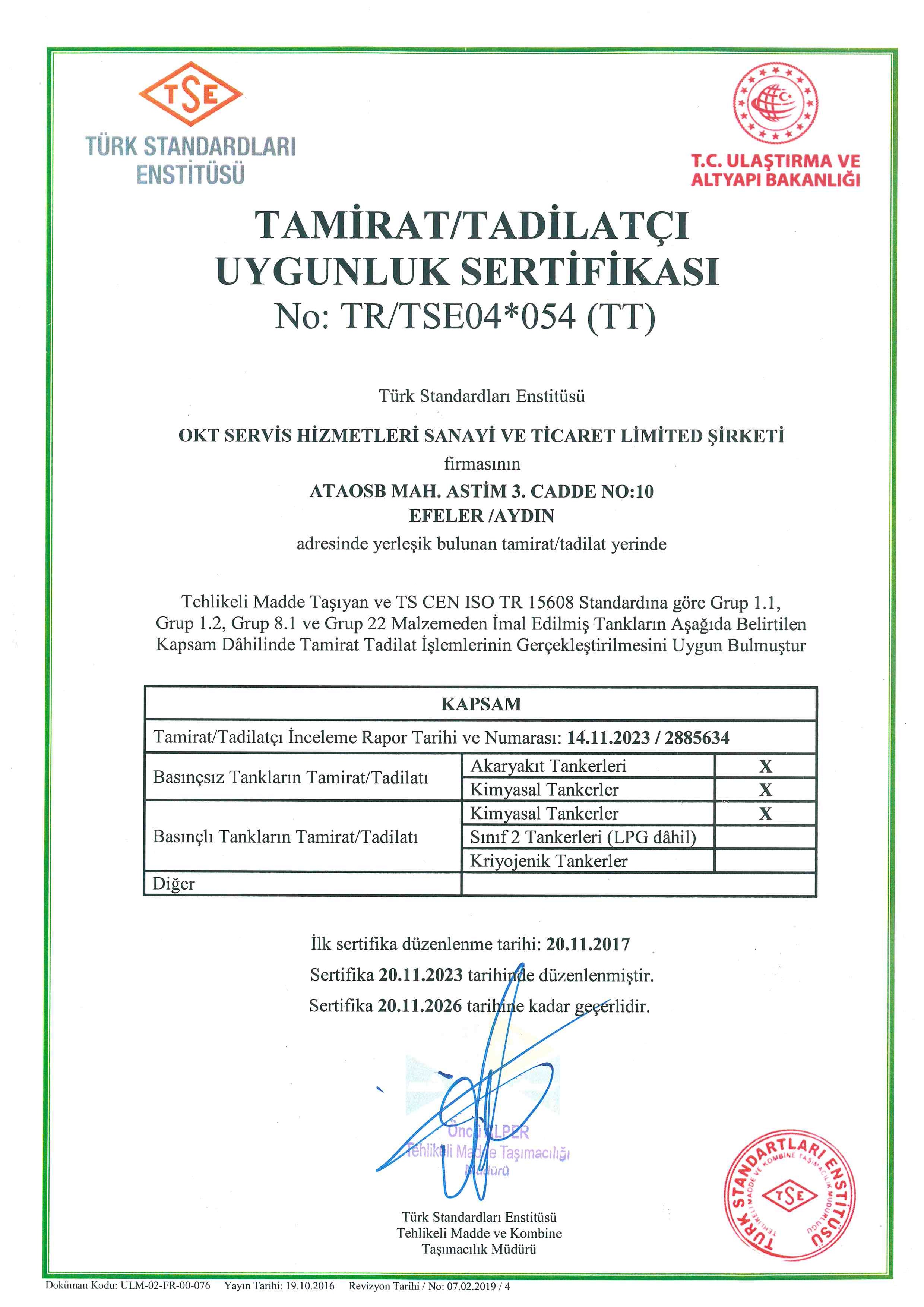 ADR konusunda sahip olduğu bilgi birikimi, tecrübesi, mühendislik kabiliyeti ve alt yapı yeterliliğiyle ADR’ li tankerlerin teslimatı sonrasında sertifikalarının devamlılığını sağlayan, ara, periyodik, istisnai ve ADR araç uygunluk muayeneleri de gerçekleştiren OKT Servis "Tehlikeli Maddelerin Karayoluyla Taşınması Hakkında Yönetmelik” in 1 Ocak 2014 itibariyle Türkiye’ de yürürlüğe girişi ile birlikte tankerlerin muayenesi aşamasında da hızlı ve eksiksiz hizmet sunuyor. Bu kapsamda OKT Servis, Araç ve Üst yapı muayene merkezi olarak karayolunda tehlikeli madde taşımacılığı yapan ADR’li araçların teknik muayenesi konusunda Türkiye’de yetkilendirilen ilk 5 firmadan biri olarak faaliyetlerini sürdürmektedir.