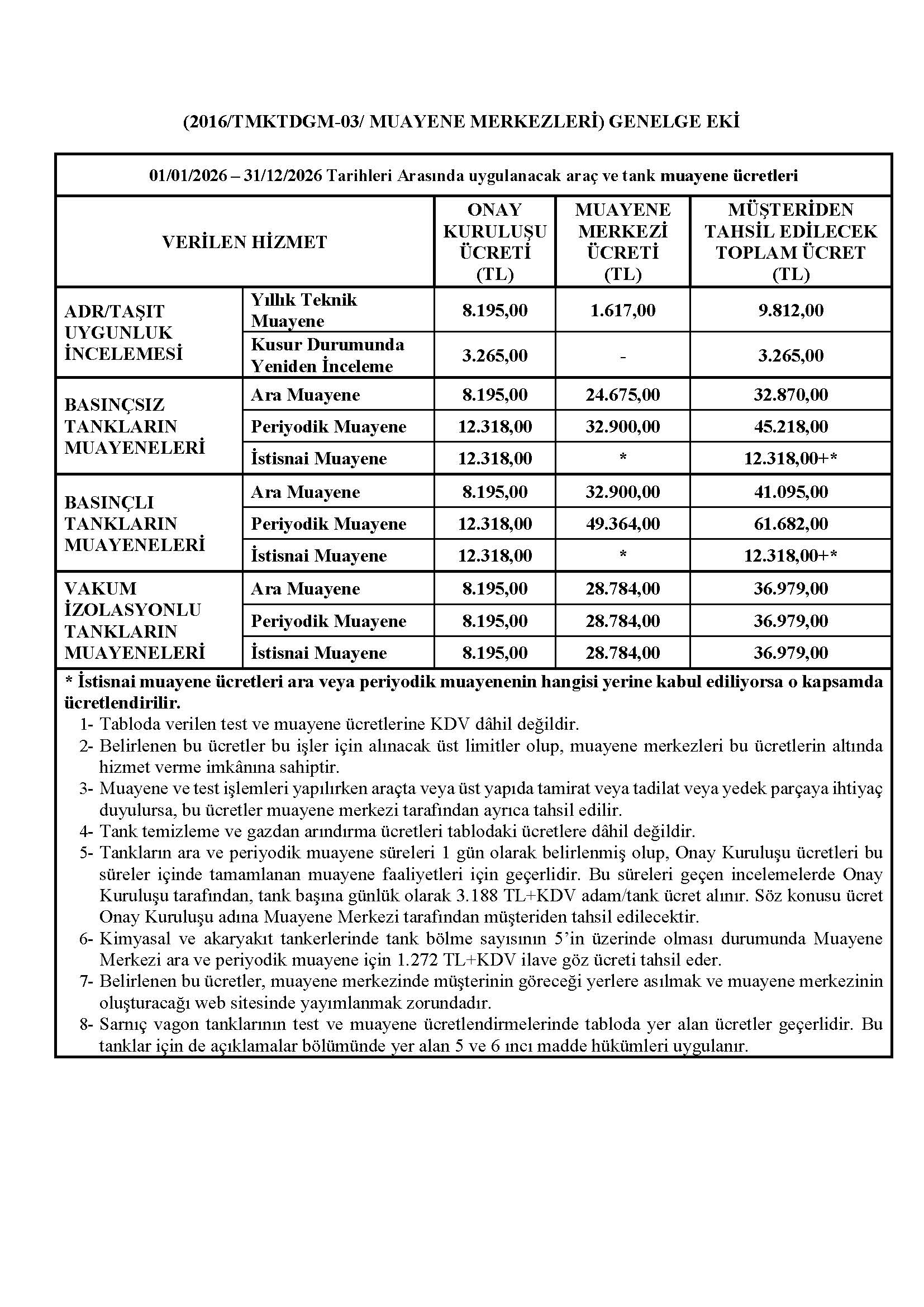 - “Durum Tespit Belgesi” almış araçların Tank Muayenesi,