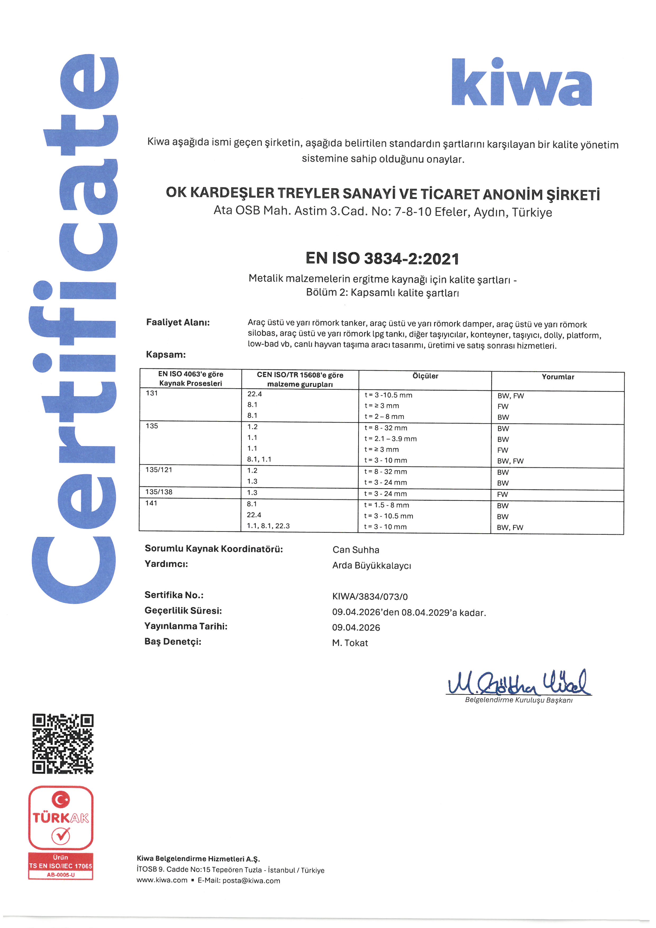 Ürün ve hizmet kalitesinden taviz vermeyen OKT Trailer, mevzuatlar ve gereksinimler doğrultusunda geçmişten bu yana kalitesini belgelendirmeyi öncelikli kılmıştır. Belgelendirme süreçlerini kendi bünyesinde içselleştirerek uluslararası kabul gören yetkili makam ve üçüncü taraf kuruluşlardan onaylı sertifikalarını sürekli ve güncel tutar.